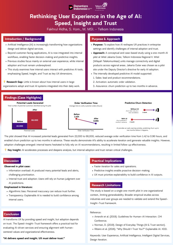 This study aims to examine how AI reshapes UX practices through the framework of Speed, Insight, and Trust. It highlights the operational benefits and adoption challenges that emerge when predictive AI systems are integrated into internal workflows within a large telecommunications enterprise.