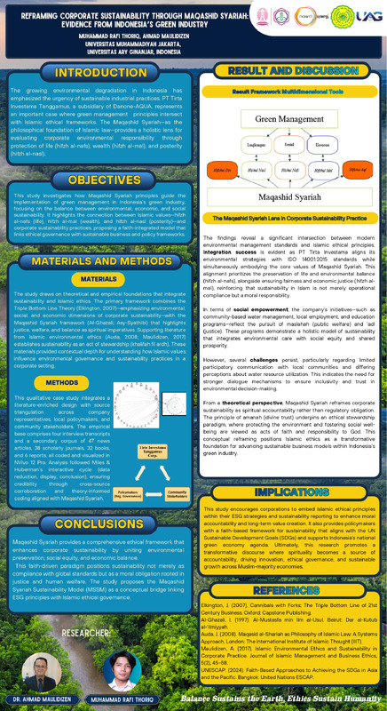 Findings – The study finds that PT Tirta Investama’s green management practices strongly align with ISO 14001:2015 environmental standards and Maqashid Syariah principles. Environmental policies and operations reflect hifzh al-nafs (protection of life) through sustainable water and waste management, and hifzh al-mal (protection of wealth) through fair resource use and local economic contribution. Stakeholder engagement further embodies maslahah (public benefit) and ‘adl (justice) by empowering communities in environmental stewardship. However, challenges persist in participatory communication and differing community perceptions of water access. Overall, triangulated qualitative evidence confirms that Maqashid Syariah reframes corporate sustainability as spiritual accountability, extending beyond compliance toward ethical and holistic stewardship.
