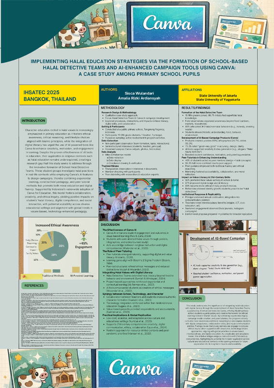 Findings – Results indicate that the School Halal Detective Team model improved students’ halal literacy, creativity, critical thinking, and digital competence. The use of Canva AI encouraged students to design meaningful and visually engaging campaigns, fostering both ethical awareness and collaboration. The approach also promoted motivation, teamwork, and digital fluency aligned with global trends in technology-enhanced education.
