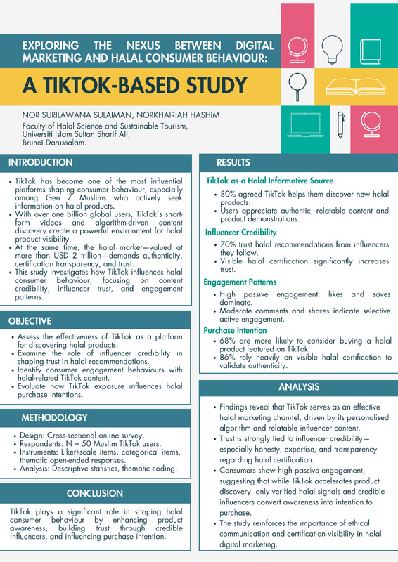 Purpose – This research explores how TikTok influences consumer behaviour, brand perceptions, and purchase intentions in the halal business sector, focusing on halal cosmetics, fashions, and food products. By examining variables such as influencer credibility, content marketing, social media interaction, and customer engagement, the study seeks to identify key factors that drive purchase intentions among Muslim consumers on TikTok.