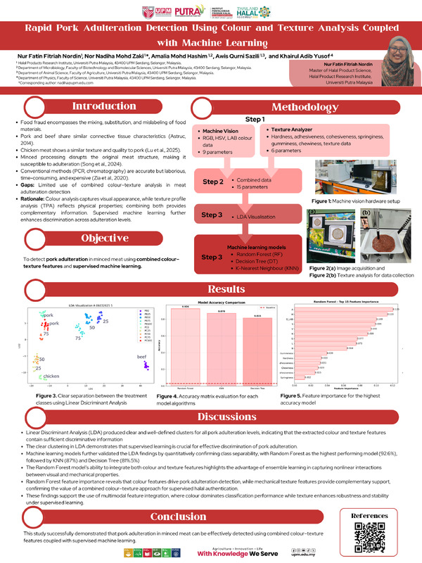 Originality/value – This study demonstrates the potential of integrating image-based colour analysis and mechanical texture profiling with machine learning, highlighting the underutilized potential of texture features in halal authentication studies. The results indicate that colour and texture parameters contain high discriminatory information for detecting pork adulteration levels. The proposed approach provides a practical foundation for developing low-cost, reliable, portable tools for scalable field applications, enabling rapid on-site screening and inspection to support halal integrity and food traceability.