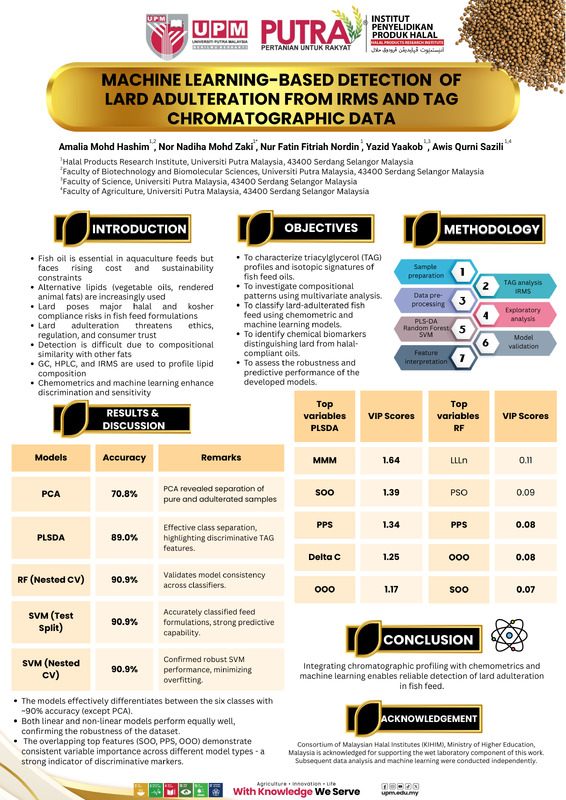 Originality/value – These results confirm that integrating chromatographic data with chemometrics and machine learning provides a reproducible, data-driven workflow for reliable and scalable authentication of Halal fish feed ingredients.