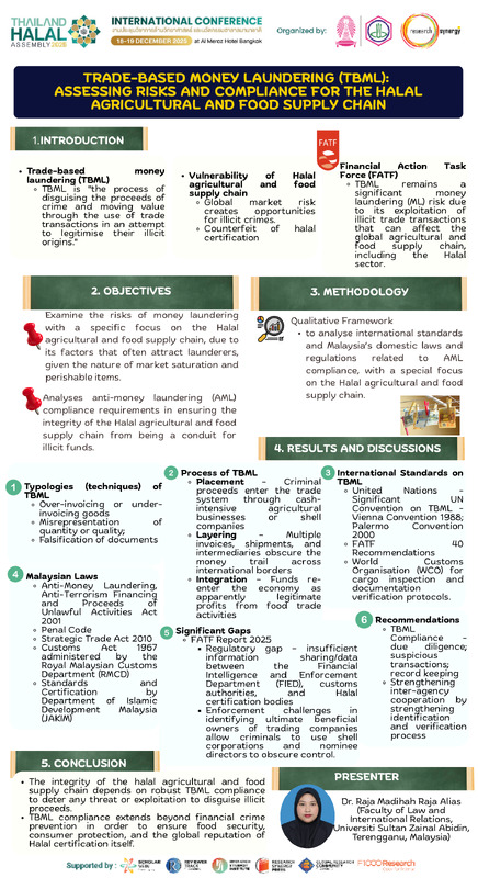 Background – Agricultural and food supply chains are among the economic sectors and products that are vulnerable to trade-based money laundering (TBML). The Financial Action Task Force (FATF) has highlighted that TBML remains a significant money laundering (ML) risk due to its exploitation of illicit trade transactions that can affect the global agricultural and food supply chain, including the Halal sector.